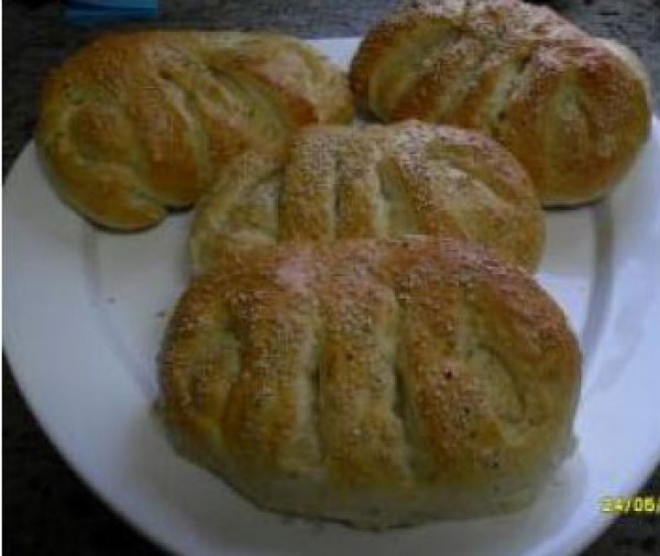 Enharinar la mesa de trabajo y dividir en 4 partes (más o menos de unos 215 gr.cada una),formar rectángulos ,hacer 4 cortes en uno de los extremos, sin llegar al final,poner el relleno en el otro extremo, y empezar a enrollar por el lado el relleno, para que queden los cortes para arriba. pintar con huevo y espolvorear con semillas de sésamo. dejar levar otra vez en un sitio cálido.