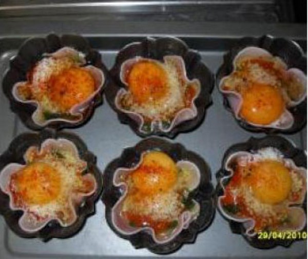 *montaje,en cada molde,loncha de jamón york estirada,espinacas,sofrito de ajo,un chorreón de tomate frito,queso parmesano rallado, un huevo,salpimentar y un poco de pimentón.