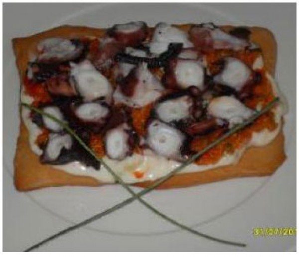 Masa: 250 gr. harina fuerza, 25 gr. levadura fresca,120 gr. agua(de cocer el pulpo), una cucharadita de sal,15 gr. aceite oliva.