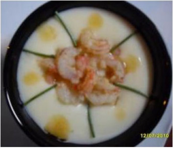 Servir la crema fría, con las gambas , espolvorear con cebollino y unas gotas de aceite de oliva.