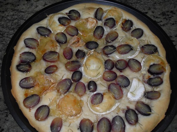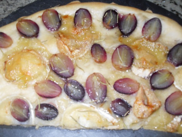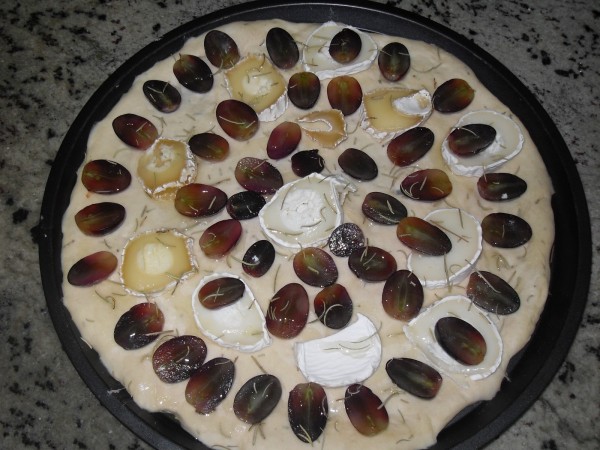 6-CORTAR LAS UVAS POR LA MITAD, COLOCARLAS, EL QUESO EN DISCOS, ESPOLVOREAR CON MÁS ROMERO Y ALIÑAR CON UN CHORREÓN DE ACEITE.
