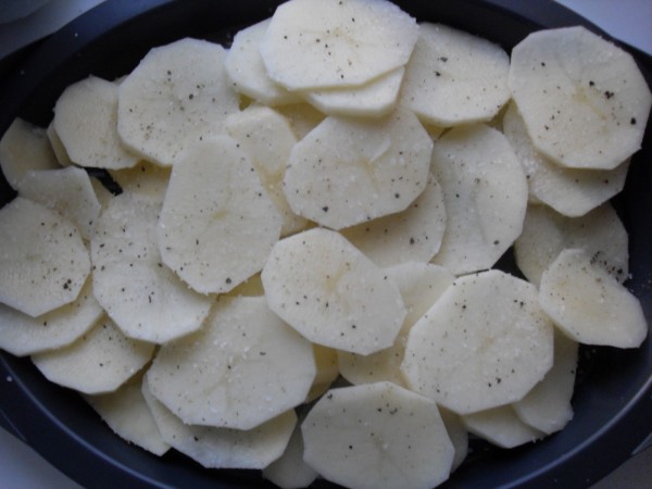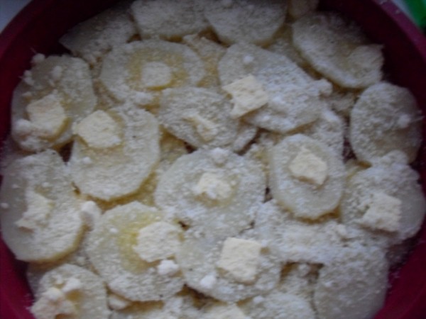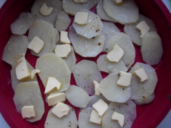 3-IR COLOCANDO EN UNA FUENTE ENGRASADA CON MANTEQUILLA O EN UN MOLDE DE SILICONA (ESTE NO HACE FALTA ENGRASARLO), UNA CAPA DE PATATAS , ENCIMA AVELLANITAS DE MANTEQUILLA REPARTIDAS Y QUESO PARMESANO ESPOLVOREADO, OTRA CAPA DE PATATAS, MANTEQUILLA Y QUESO, ASI SUCESIVAMENTE, ACABAR CON EL QUESO.