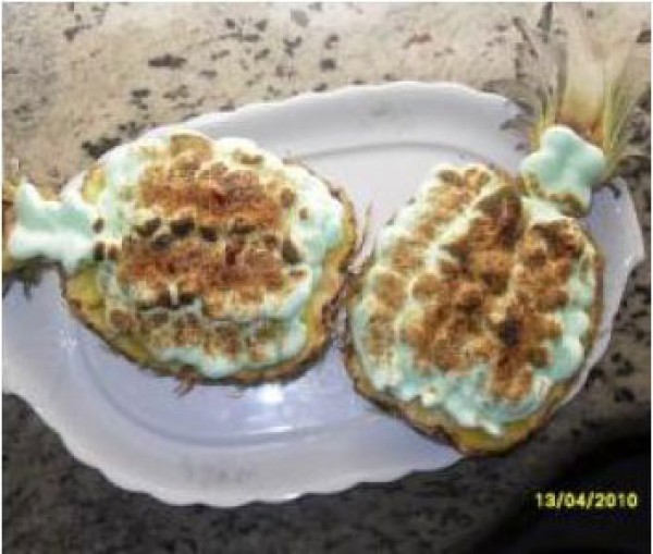 rellenar la piña, y adornar con la clara,espolvorear con azúcar moreno y quemar con soplete.