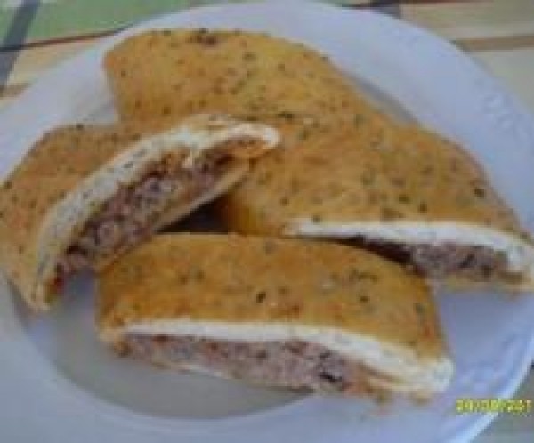 ESTIRAR LA MASA CON UN RODILLO, FORMANDO UN RECTÁNGULO, REPARTIR EL TOMATE Y LA CARNE, QUITANDO EL EXCESO DE LÍQUIDO,ENROLLAR ,PINCELAR CON HUEVO BATIDO Y ESPOLVOREAR CON ORÉGANO.