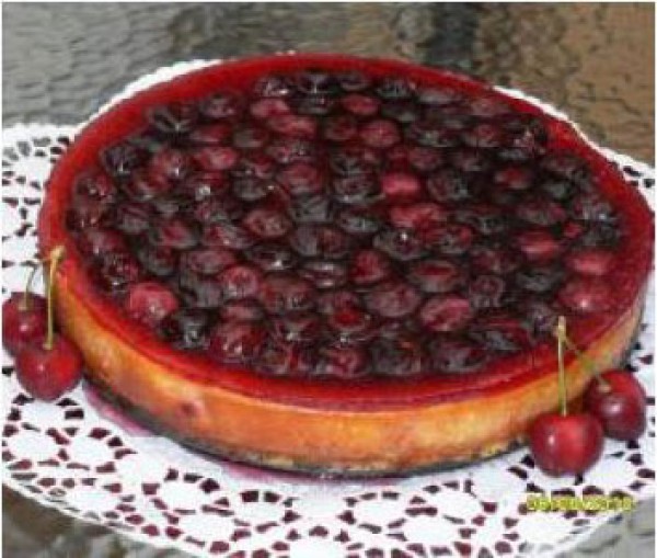 170 gr. de azúcar y 180 de agua en el vaso, poner 2 ó 3 minutos que llegue a 90º,poner la mariposa y echar la cerezas deshuesadas, se quita mejor el hueso por el lado contrario al rabo, 10 min. 90º vel. cuchara. escurrir las cerezas, poner encima de la tarta.
