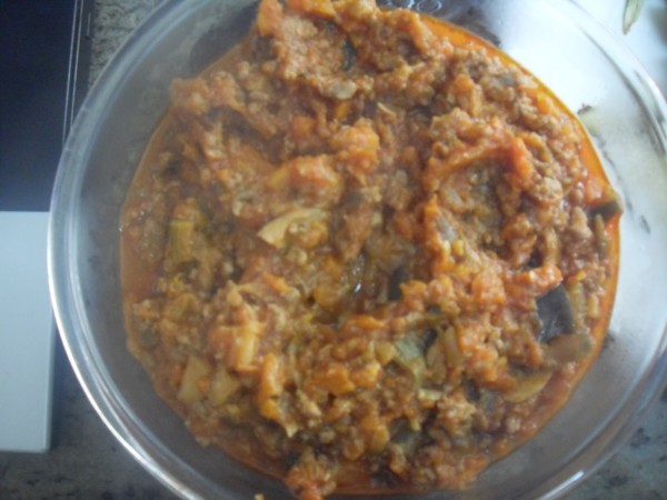 5-AGREGAR EL TOMATE, LA CARNE DE LAS BERENJENAS, SAL Y PIMIENTA, 15 MIN. VAROMA, VEL.1. CUANDO ACABE, TRITURAR 1 SEG. VEL.5.