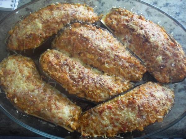 6-RELLENAR LAS BERENJENAS, CUBRIR CON QUESO RALLADO, YO PUSE MEZCLA DE EMMENTAL Y PARMESANO, HORNO PRECALENTADO A 200º, 15 MINUTOS, GRATINAR UN POCO SI SE DESEA.
