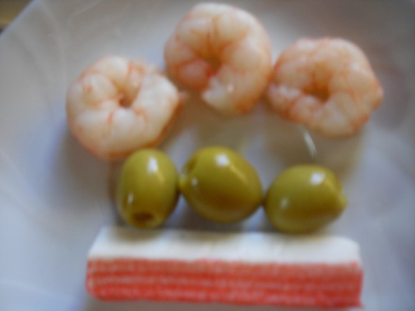 4- COCER LAS GAMBAS DESCONGELADAS, 200 GR. AGUA AL VASO, 4 MIN. VAROMA, VEL. CUCHARA, GIRO IZDA. ESCURRIR, (YO EL CALDO LO UTILIZO PARA UN ARROZ, O ALGO SIMILAR), AÑADIR LOS PALITOS, ACEITUNAS Y ATÚN, 2 SEG. VEL.5. AGREGAR 200 GR. DE LA MAYONESA DE SALMÓN, 1 SEG. VEL.5.