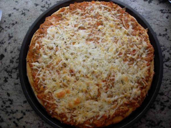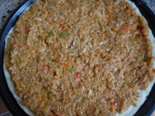 2- AHORA EL RELLENO: CEBOLLA Y PIMIENTOS, 2 SEG. VEL.5. AÑADIMOS EL ACEITE, TOMATE, SAL Y AZÚCAR, 25 MIN. VAROMA, VEL.1. MEZCLAR CON EL ATÚN ESCURRIDO Y DEJAR ENFRIAR Y RELLENAR LA PIZZA, ESPOLVOREAR CON QUESO RALLADO DE MOZZARELLA Y ORÉGANO.