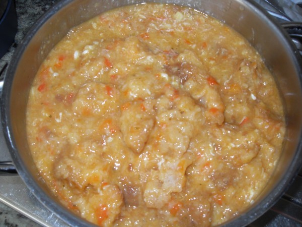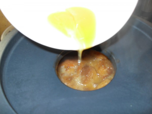 7-AGUA CALIENTE (MÍNIMO UN LITOR, SI QUEREMOS MÁS SUELTA, AUMENTAMOS LA CANTIDAD) , CACITO Y UN POCO DE SAL, 5 MIN. ,100º (PONEMOS A ESA TEMP. PARA QUE NO SE DESTROCE EL PAN), Y EN EL ÚLTIMO MINUTO, ECHAR EL HUEVO CON LA YEMA ROTA POR EL BOCAL,