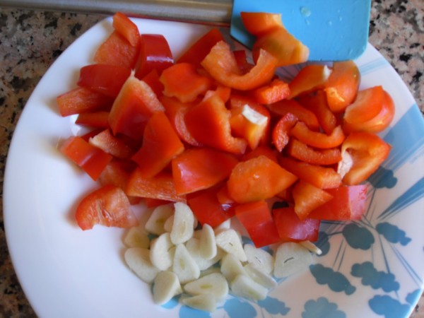 2-CORTAR EL PIMIENTO EN CUADRADOS Y EL AJO EN REBANADAS. RESERVAR.