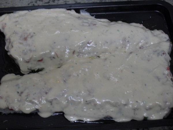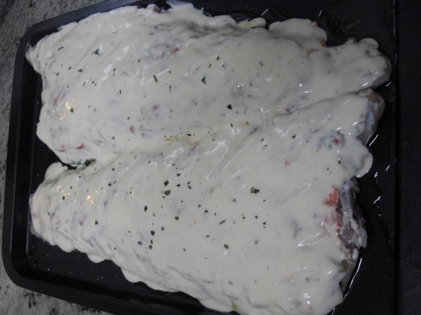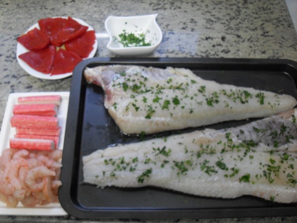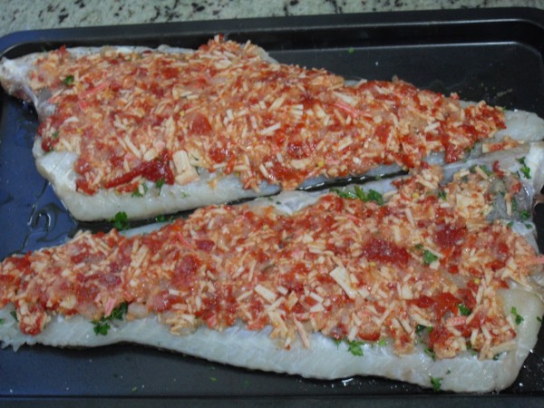 2-UNTAR UNA BANDEJA CON ACEITE DE OLIVA, COLOCAR EL PESCADO SALPIMENTADO, CHORREÓN DE ACEITE, Y PEREJIL PICADO, Y EXTENDER LA PICADA. RESERVAR.