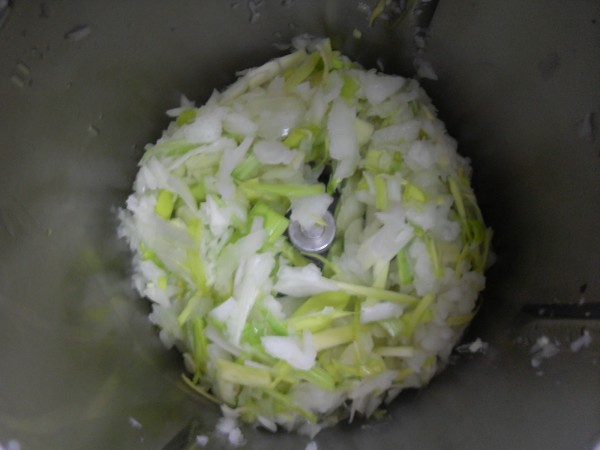2-PICAR EL PUERRO Y LAS CEBOLLAS, 2 SEG. VEL.5. AÑADIR EL ACEITE, COLOCAR EL VAROMA ENCIMA Y PROGRAMAR 25 MIN. VAROMA, VEL.2.