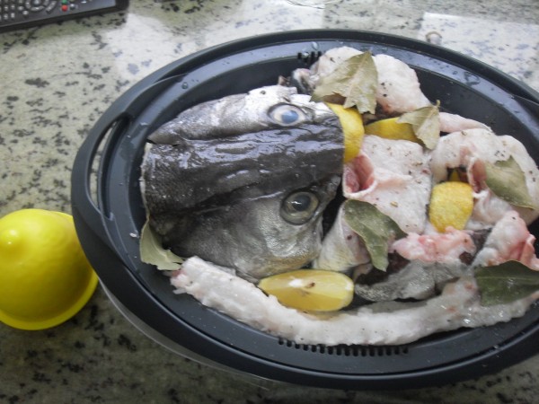 1-COLOCAR LA MERLUZA EN RODAJAS (YO TAMBIÉN HE PUESTO LA CABEZA), SALPIMENTADA, ROCIARLA CON ZUMO DE LIMÓN Y VINO BLANCO Y LAUREL, EN LA BANDEJA DEL VAROMA. RESERVAR.