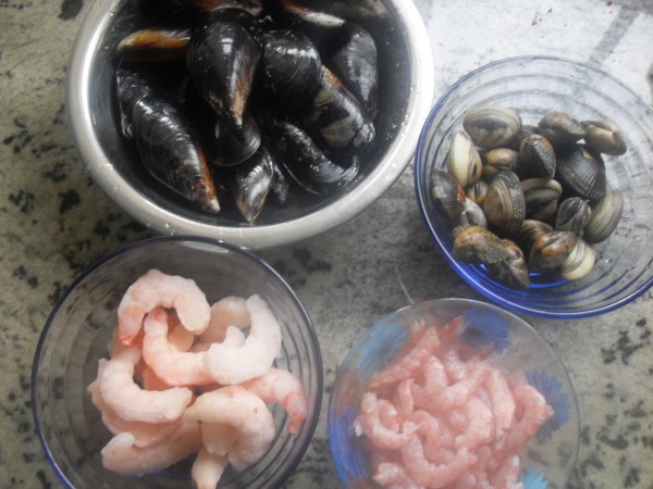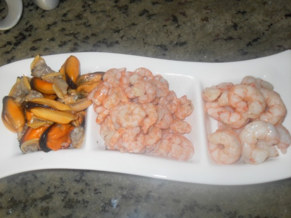 EL MARISCO SIN CONCHAS Y LISTO PARA ECHAR A LA MEZCLA.
