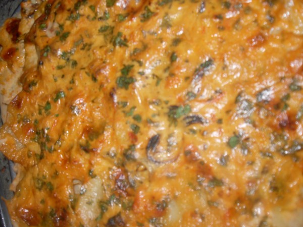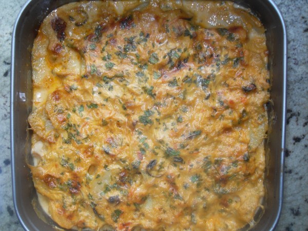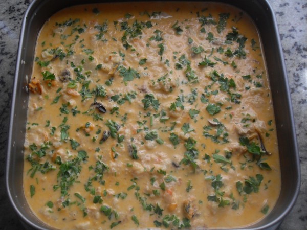 8-AÑADIR POR ENCIMA DE LAS PATATAS,ESPOLVOREAR CON PEREJIL PICADO ABUNDANTEMENTE, HORNO PRECALENTADO A 200º, UNOS 20 A 30 MIN., HASTA QUE ESTÉ CASI CUAJADO, DEJAR TEMPLAR UN POCO Y SERVIR.