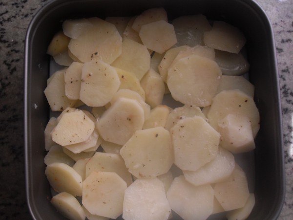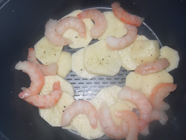 2-CORTAR LAS PATATAS EN DISCOS, SALPIMENTARLAS Y REPARTIRLAS POR EL FONDO JUNTO A LAS GAMBAS CONGELADAS (150 GR) Y EN LA BANDEJA, ,LAS GAMBAS PELADAS (250 GR). FOTOS.