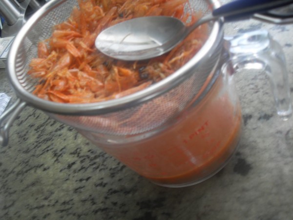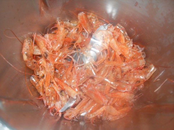 1-PELAR LAS GAMBAS, RESERVAR LOS CUERPOS, LAS PIELES Y CABEZAS, OFREÍRLAS CON 20 GR. DE ACEITE, 5 MIN. VAROMA, VEL.CUCHARA. AÑADIR EL COÑAC Y VINO BLANCO, QUITAR EL CUBILETE PARA QUE EVAPORE, 5 MIN. VAROMA, VEL.2. COLAR EL CALDO Y RESERVAR.