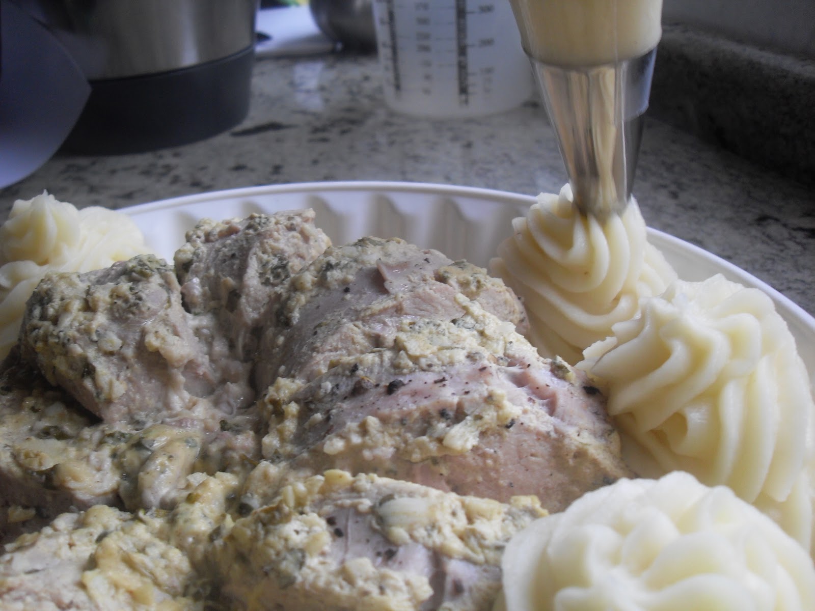 5-HACER EL PURÉ., SIN QITAR LA MARIPOSA, AÑADIR EL ACEITE, MANTEQUILLA Y PIMIENTA, 30 SEG. VEL.3. METER EN UNA MANGA, CON BOQUILLA RIZADA GRUESA, Y HACER ROSETONES, ALREDEDOR DE LA CARNE, ESPOLVOEARLOS CON QUESO PARMESANO RALLADO.