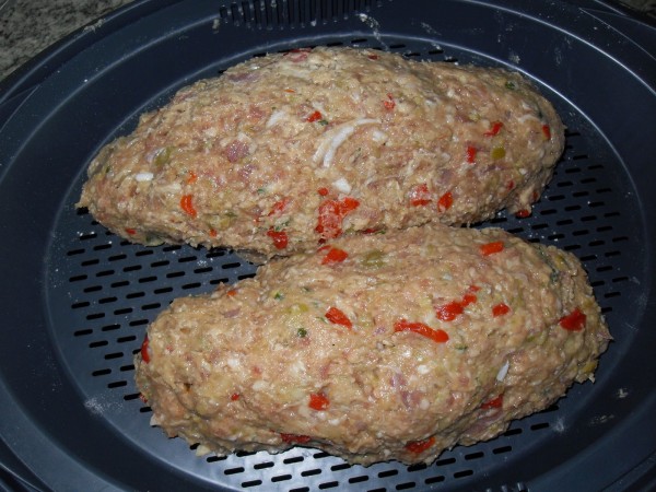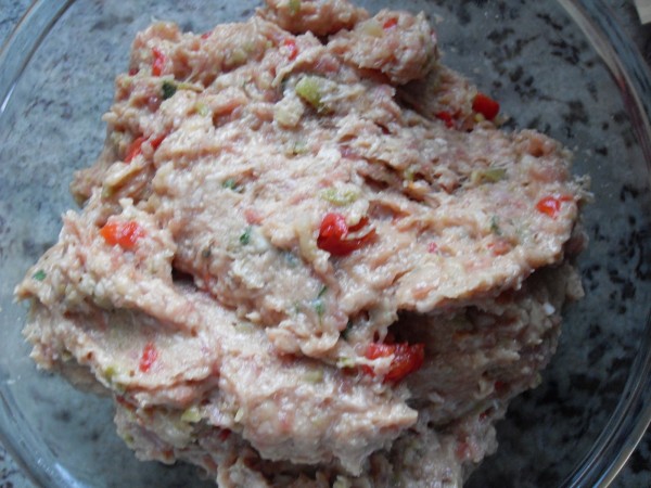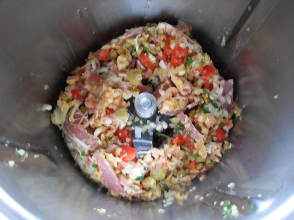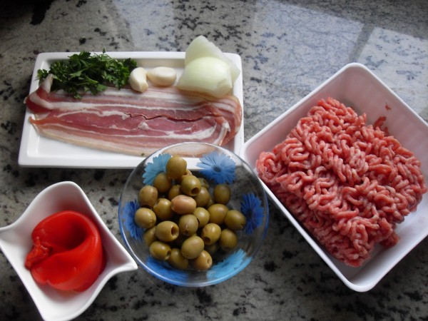 1-CEBOLLA ,AJOS Y PEREJIL, 5 SEG. VEL.5. AÑADIR EL BACON, PIMIENTOS Y ACEITUNAS, 3 SEG. VEL.5. AGREGAR LA MIGA DE PAN REMOJADA EN LA LECHE, CARNE, PAN RALLADO, HUEVOS, SAL Y PIMIENTA, 10 SEG. VEL.5. METER EN LA NEVERA A REPOSAR 2 HORAS.