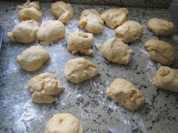 6-desgasificar, cortar porciones de unos 60 gr. hacer como tortitas y poner el relleno congelado en el centro, cerrar bien apretando la masa por debajo de cada bollo.