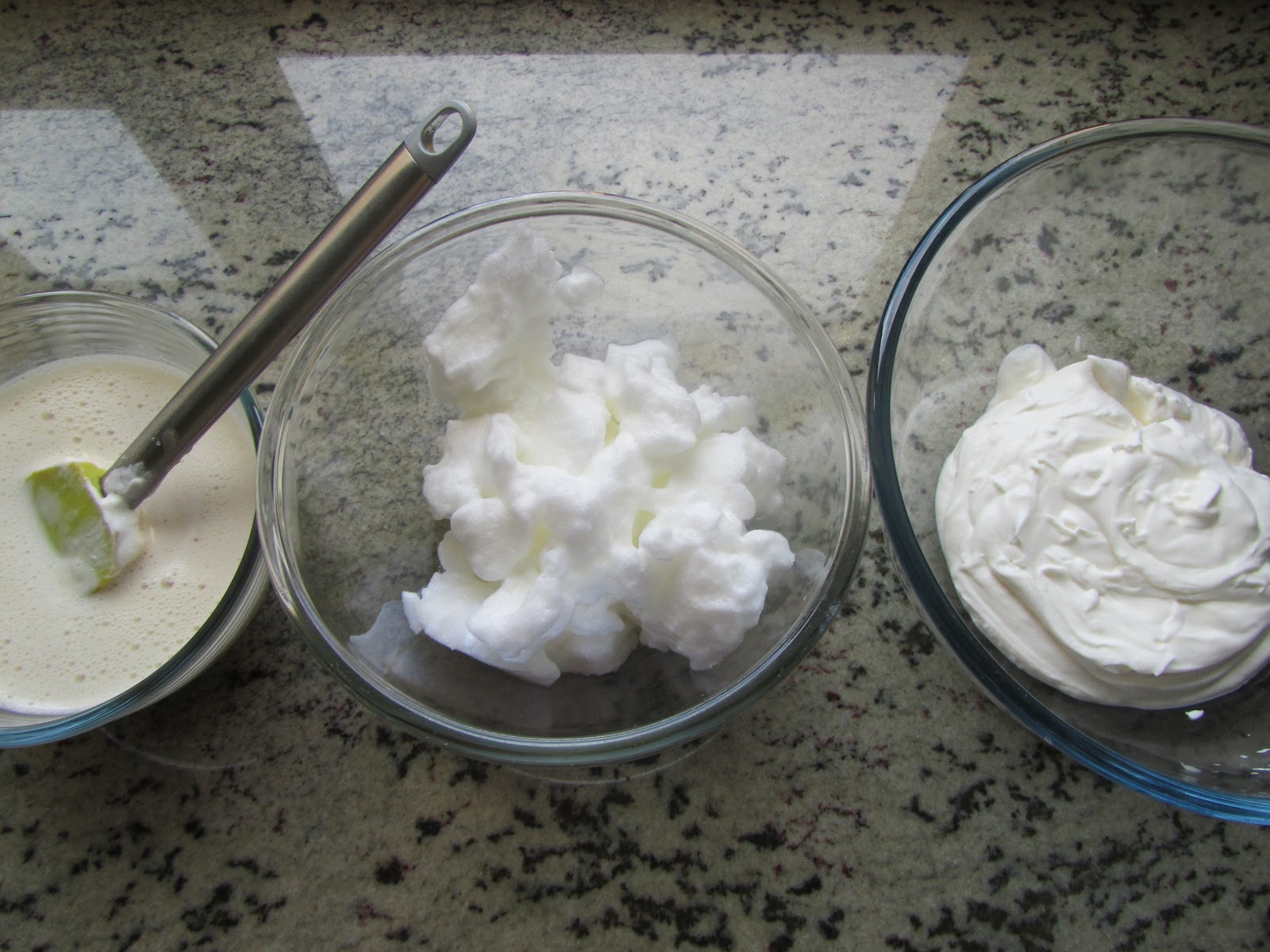 montamos claras, semi-montamos la nata y calentamos para diluir la gelatina los dos tipos de leche