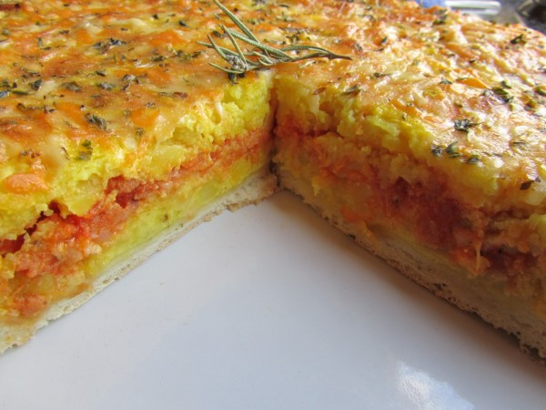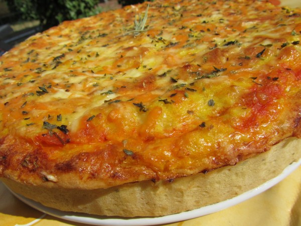 5- Estirar la masa una vez desgasificada y forrar un molde de quiche , fondo y paredes, ayudaros con los dedos. Extender la mitad de la tortilla alisando bien, cubrir con el tomate y napar con el resto de tortilla. Espolvorear con queso rallado y orégano .