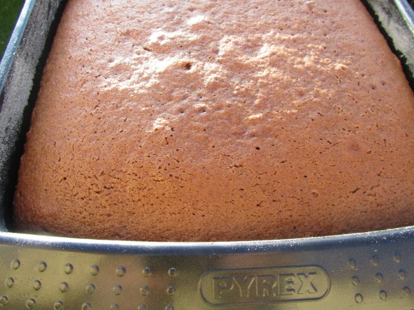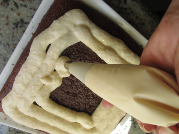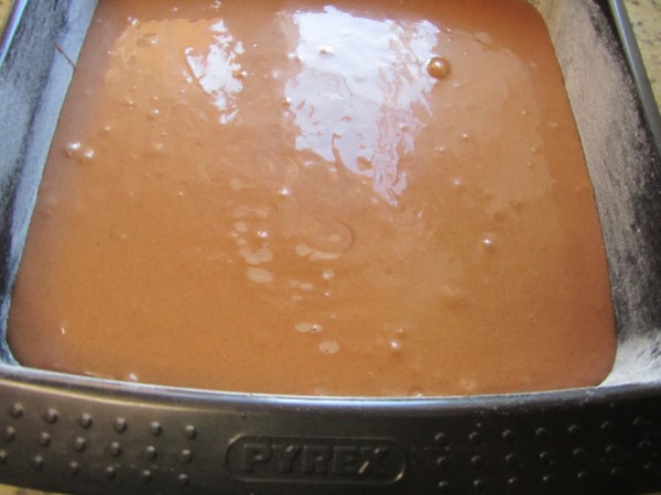6- Mezcla de harina y cacao, 10 seg. vel.4. Terminar de envolver y volcar en un molde engrasado de unos 24 x 24 cm.