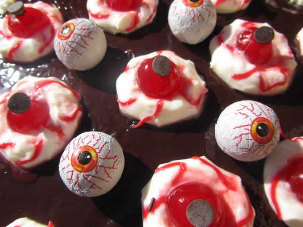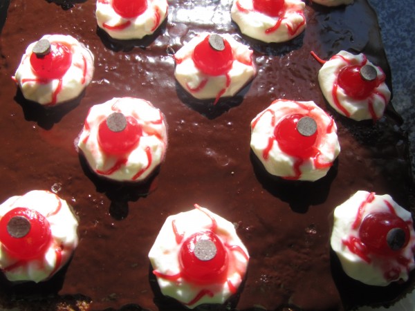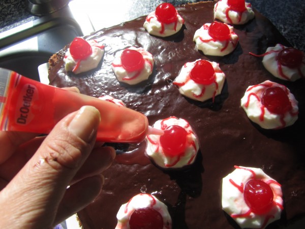 con unos simple pegotitos de nata, guindas rojas y un poco de glasa o sirope de fresa, ojos sangientosss!! Argggg