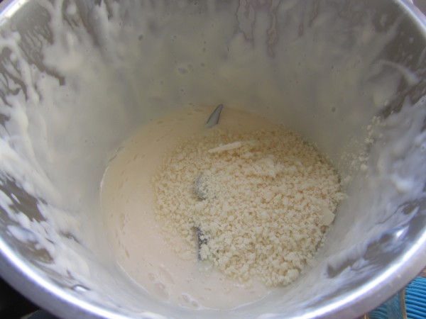1- Triturar el chocolate blanco con golpes de turbo. Reservar.