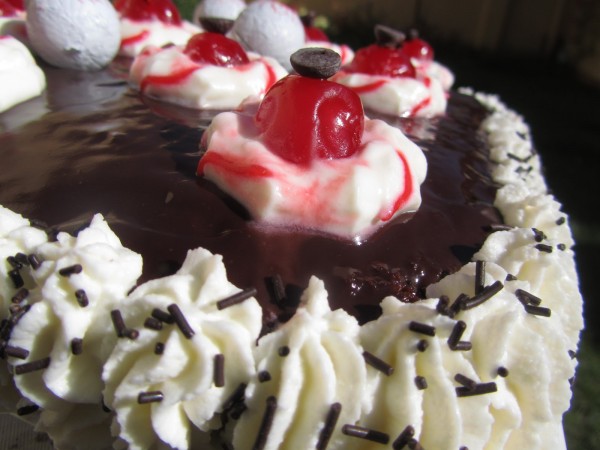 3- Adornar, con pegotitos de nata, guindas sin escurrir, pinchando una gotita de chocolate en cada una, y si tenéis un poco de glasa roja o unos chorritos de sirope de fresa, hacer las venitas.