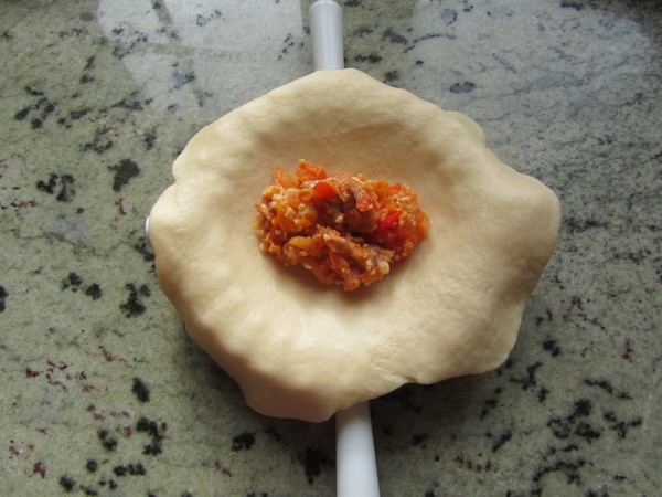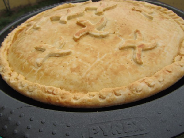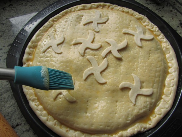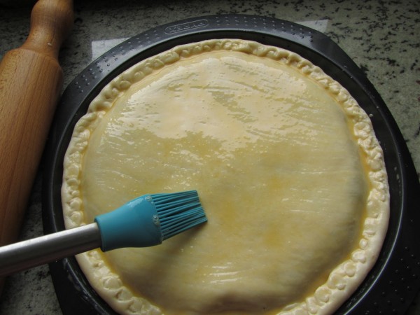 4- Dividir la masa en dos, estirar, extender el relleno, tapar y sellar los bordes. Pintar con huevo y pinchar un poco.