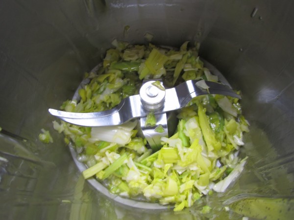 1- Primero hacemos el relleno. Puerro en rodajas y aceite, 2 seg. vel.5. Bajar restos hacia las cuchillas y sofreír 6 min. Varoma, vel. cuchara.