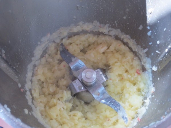 2- Picar la cebolla y el ajo con el aceite, 2 seg. vel.5. Bajar restos hacia las cuchillas y pochar 6 min. Varoma, vel.1.