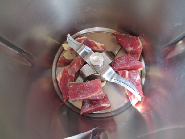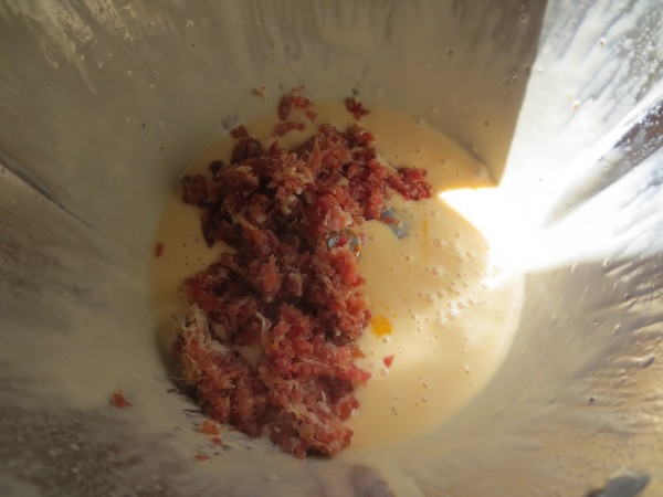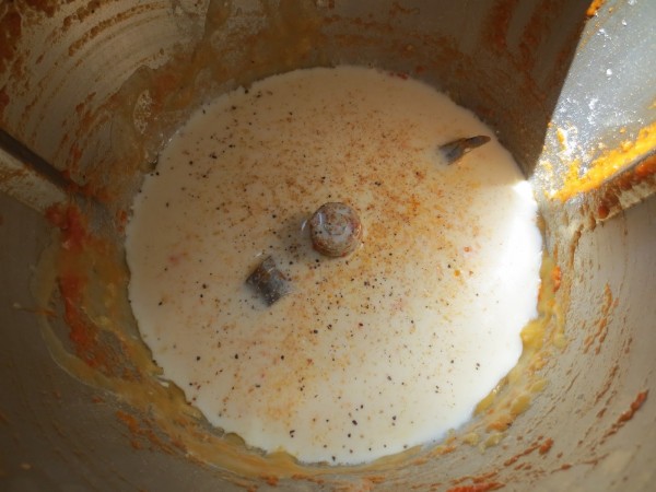 6- Leche, sal, pimienta y nuez moscada, 5 min. 100º, vel.4. A continuación el jamón picado (Yo reservo un poquito para espolvorear), 30 seg. 100º, vel.2.