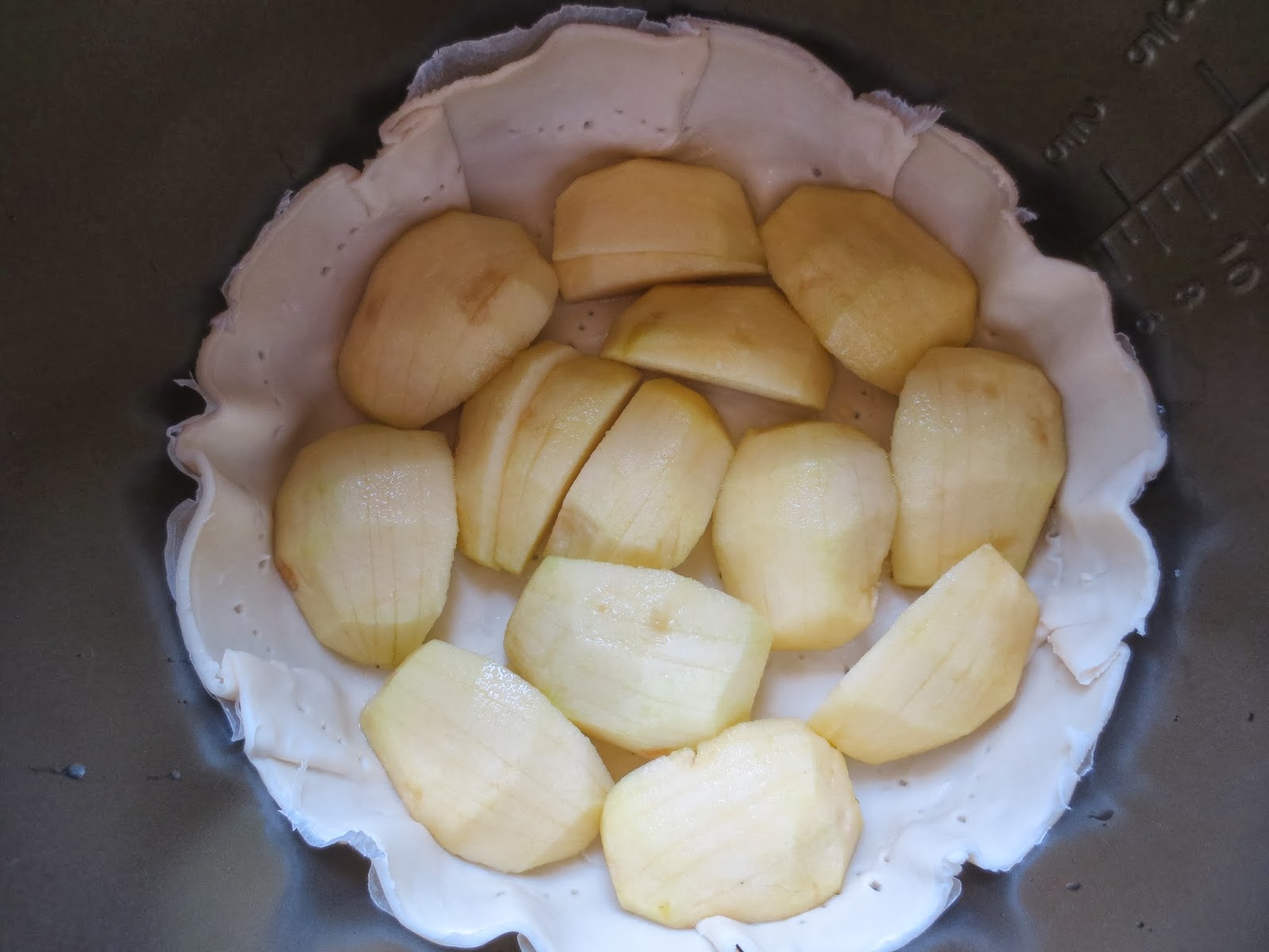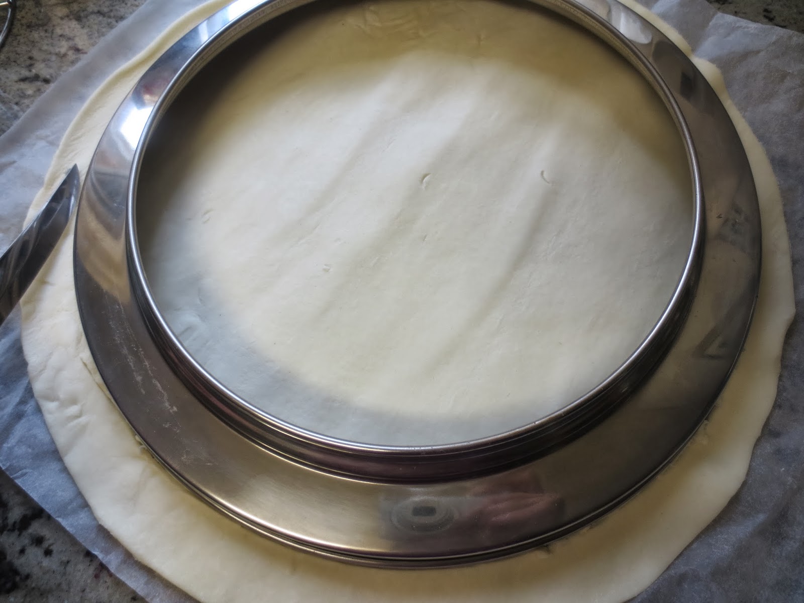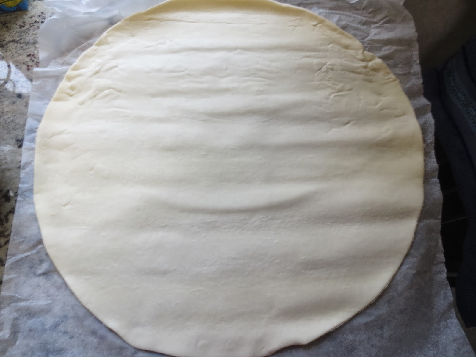 Preparación:1- Cortar el hojaldre junto al papel de hornear con el que viene debajo, 3 ó 4 cm. , más grande que el diámetro de la cubeta, si tenéis el cabezal de hornear, justo el diámetro del adaptador plateado. Introducir dentro del fondo de la cubeta y aplastar un poco los bordes contra las paredes y pinchar bien con un tenedor.