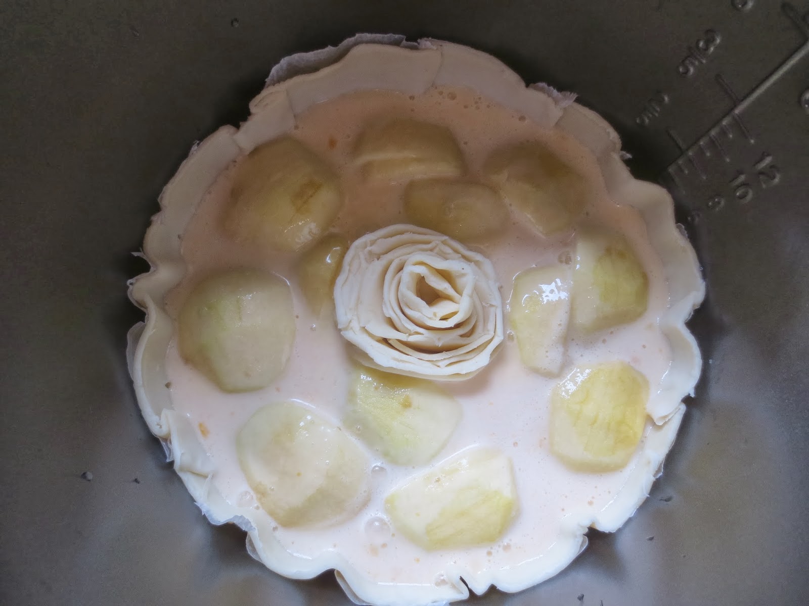 3- Volcar la preparación por encima de las manzanas. Yo aprovecho todo el reborde del hojaldre y lo coloco en medio a forma de rosa,jejeje.
