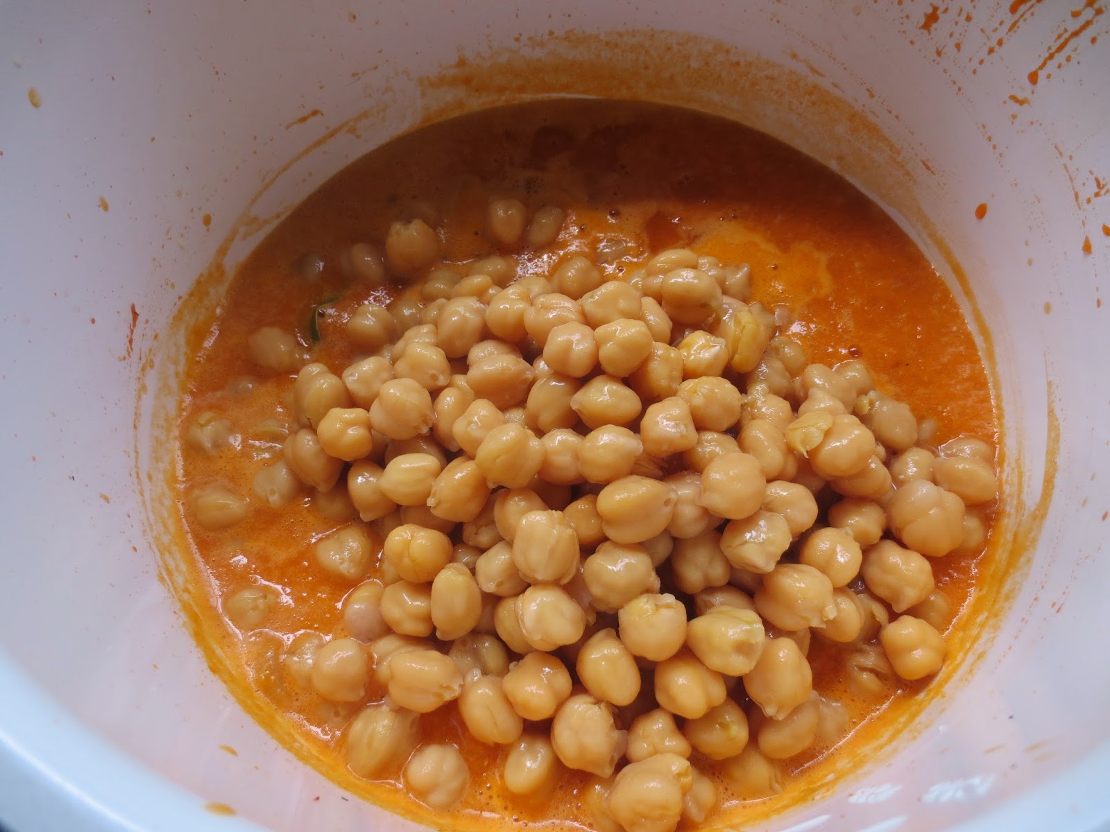 3- Agregar el tomate y 3/4 cubilete de garbanzos, sofreír 2 minutos y triturar con un poco de agua o caldo en thermomix o con el turmix. volcar de nuevo en la cubeta.