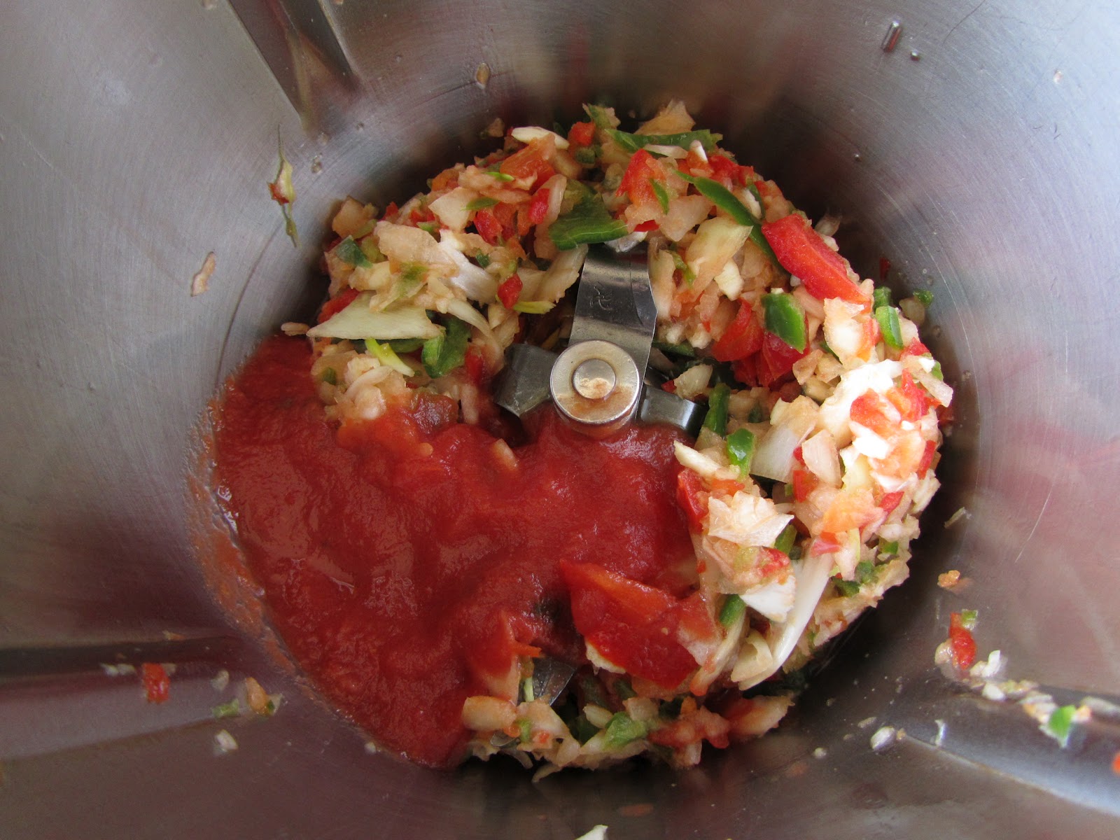 2- Sin lavar el vaso, cebolla, ajos, pimiento rojo y verde y calabacín, 2 seg. vel.5. Bajar restos.