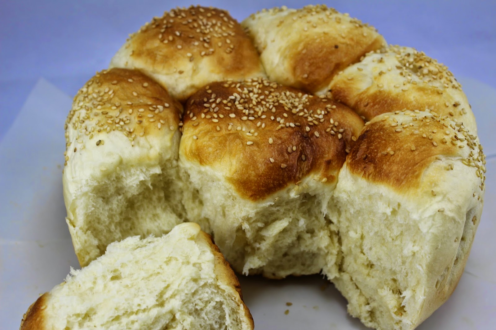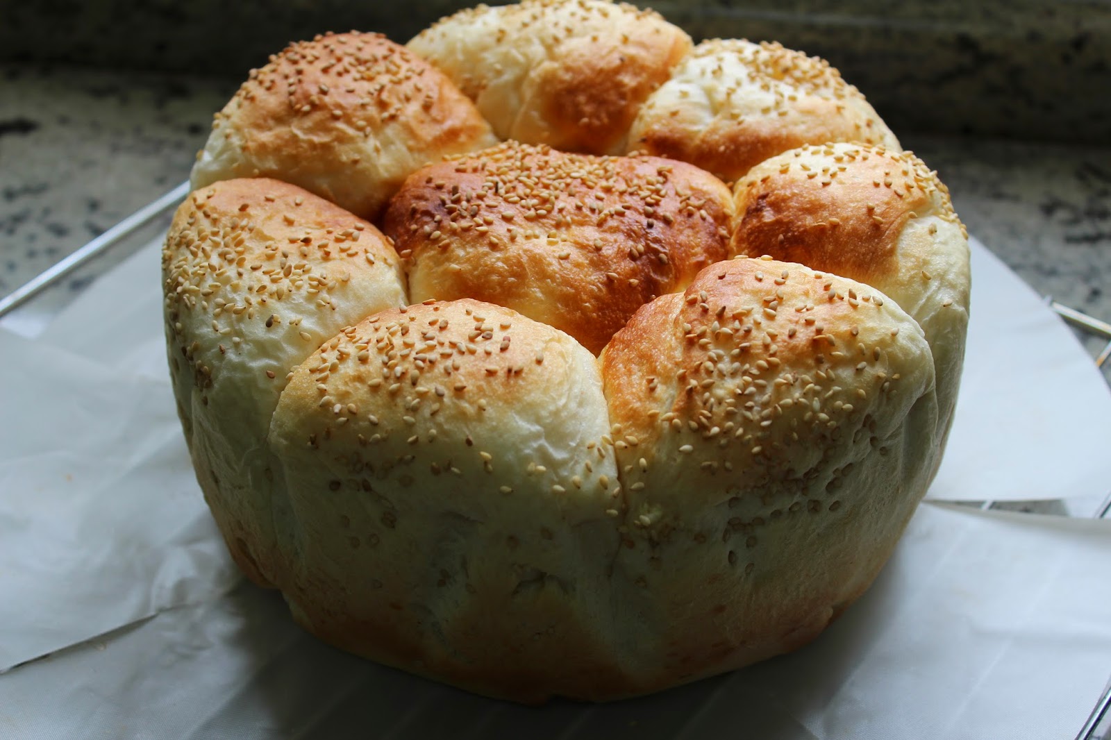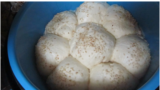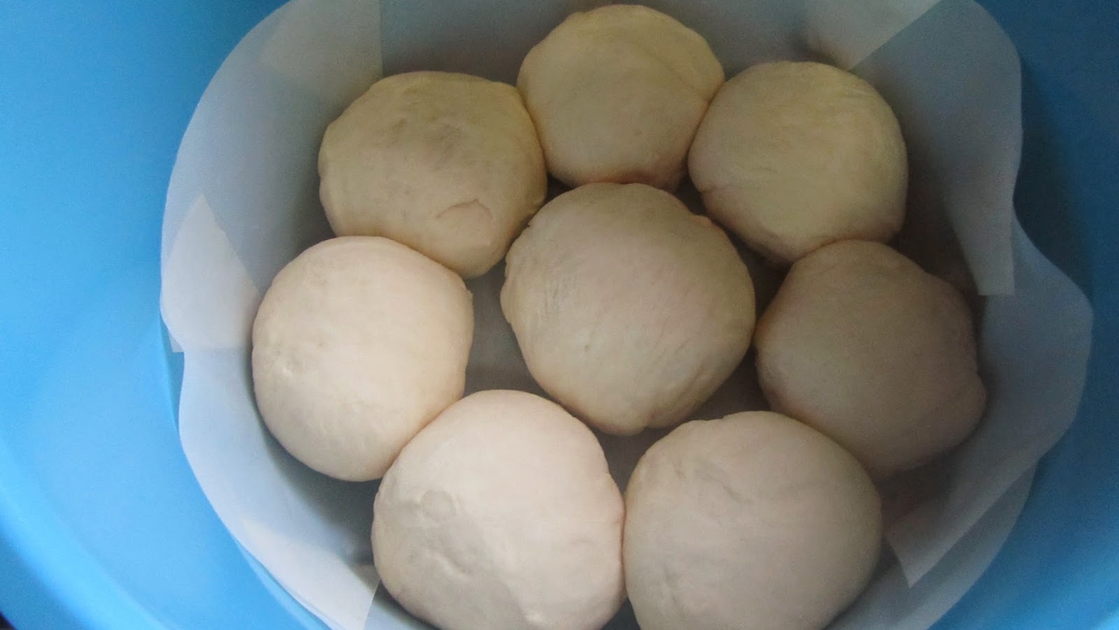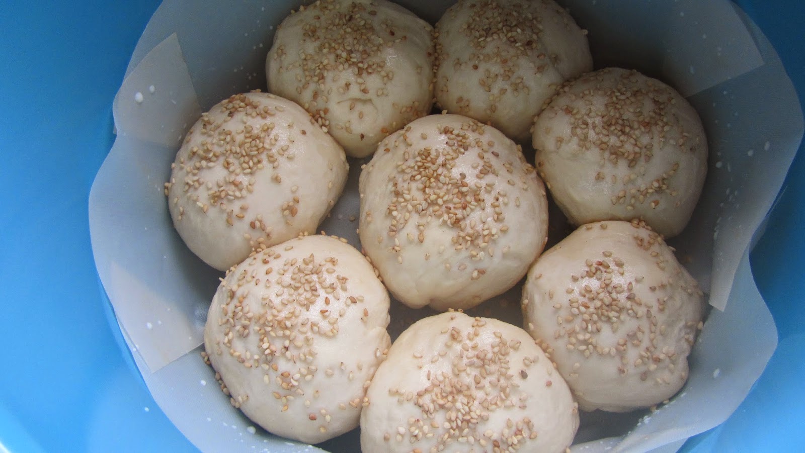 2- Desgasificar amasando un poco para quitar el aire. Dividir en 8 porciones iguales más o menos y bolear formando bollitos. Ir colocando en la cubeta forrada con papel de hornear. Pintar con una brocha con leche templada, y es polvorear sésamo .