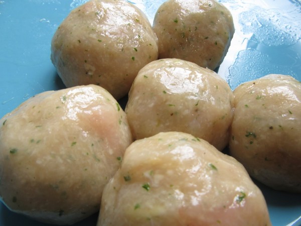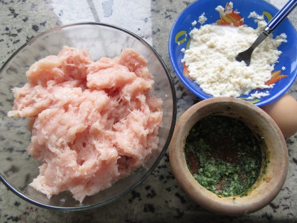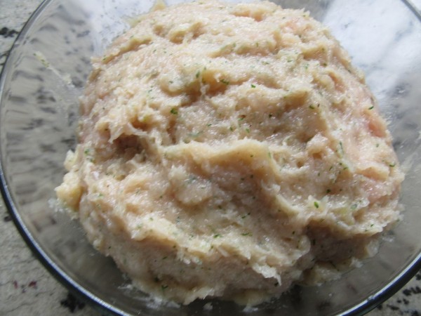 1- Majar los ajos y perejil con sal, añadir la pechuga, pan embebido en la leche, huevo y pimienta, y mezclar bien. Llevar en un bol a la nevera, una hora mínimo.