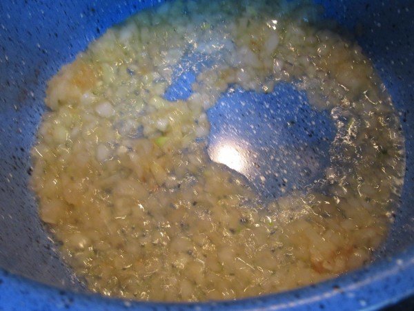 2- En el mismo aceite de freir la carne, (yo quito un poquito), pochar hasta que esté blanda la cebolla , resto de ajos (2).