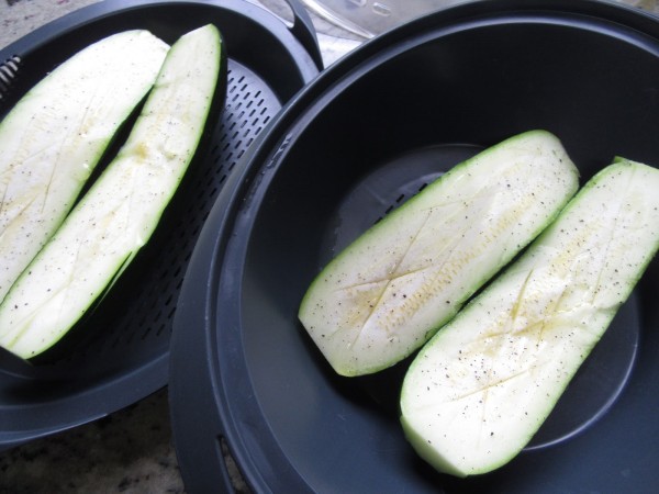 1- Cortar los calabacines transversalmente, hacer unos cortes en la pulpa, chorrito de aceite, sal y pimienta, colocar en el varoma. Reservar.