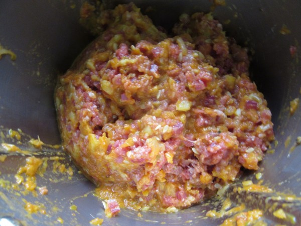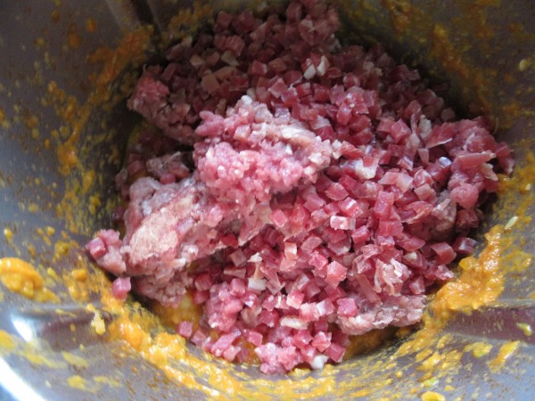 6- Añadir al vaso el jamón serrano y la carne picada, remover el conjunto con la espátula y guisar 10 min. Varoma, giro izda, vel. 1. Sin cubilete.