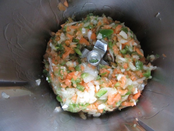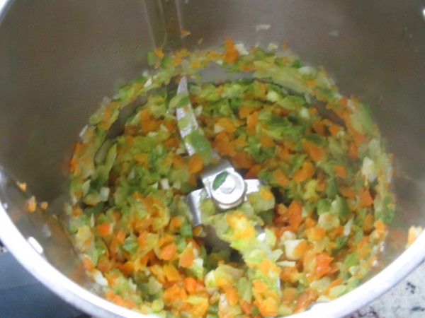 2- Cebolla, ajos, pimiento y zanahoria, 4 seg. vel.4. Añadir 30 gr.de aceite y sofreír 10 min. varoma, vel. cuchara, sin cubilete.