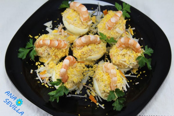 4- Rellenar los huevos, adornar con yema pasada por un tamiz o colador y un langostino en cada mitad. Servir fríos.
