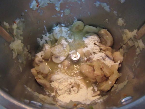 3- Agregar los champiñones en láminas y 5 min. Varoma, giro izda, vel cuchara. A continuación la harina, 1 min. 100º, giro izda. vel. cuchara.