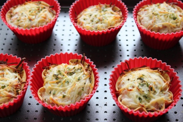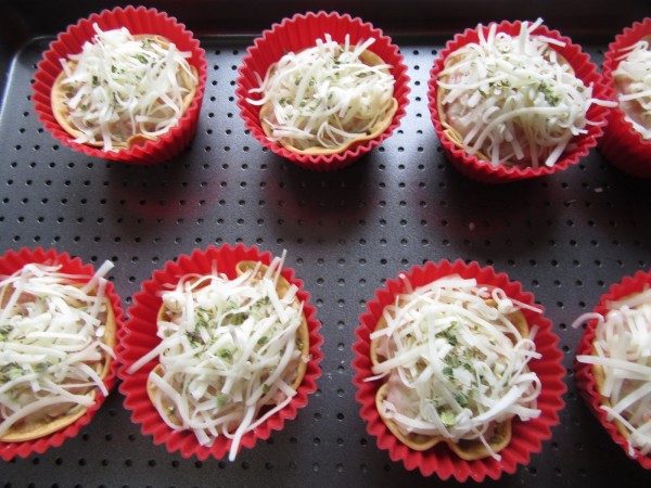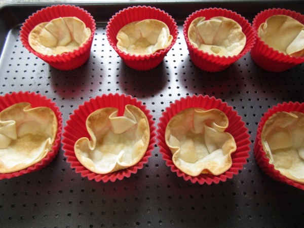 1- Precalentar el horno a 200º. Colocar las obleas en moldecitos de magdalenas y hornear unos 10-12 minutos hasta que doren.