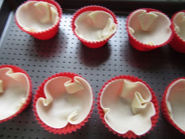 1- Precalentar el horno a 200º. Colocar las obleas en moldecitos de magdalenas y hornear unos 10-12 minutos hasta que doren.