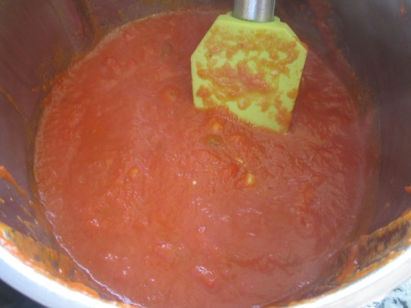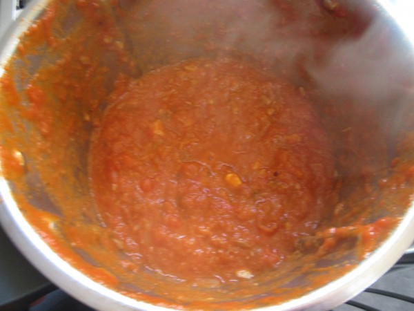2- Añadir el tomate, sal, pimienta y azúcar, 15 min. Varoma, vel.1., sin cubilete, colocar el cestillo en su lugar, para evitar salpicaduras.